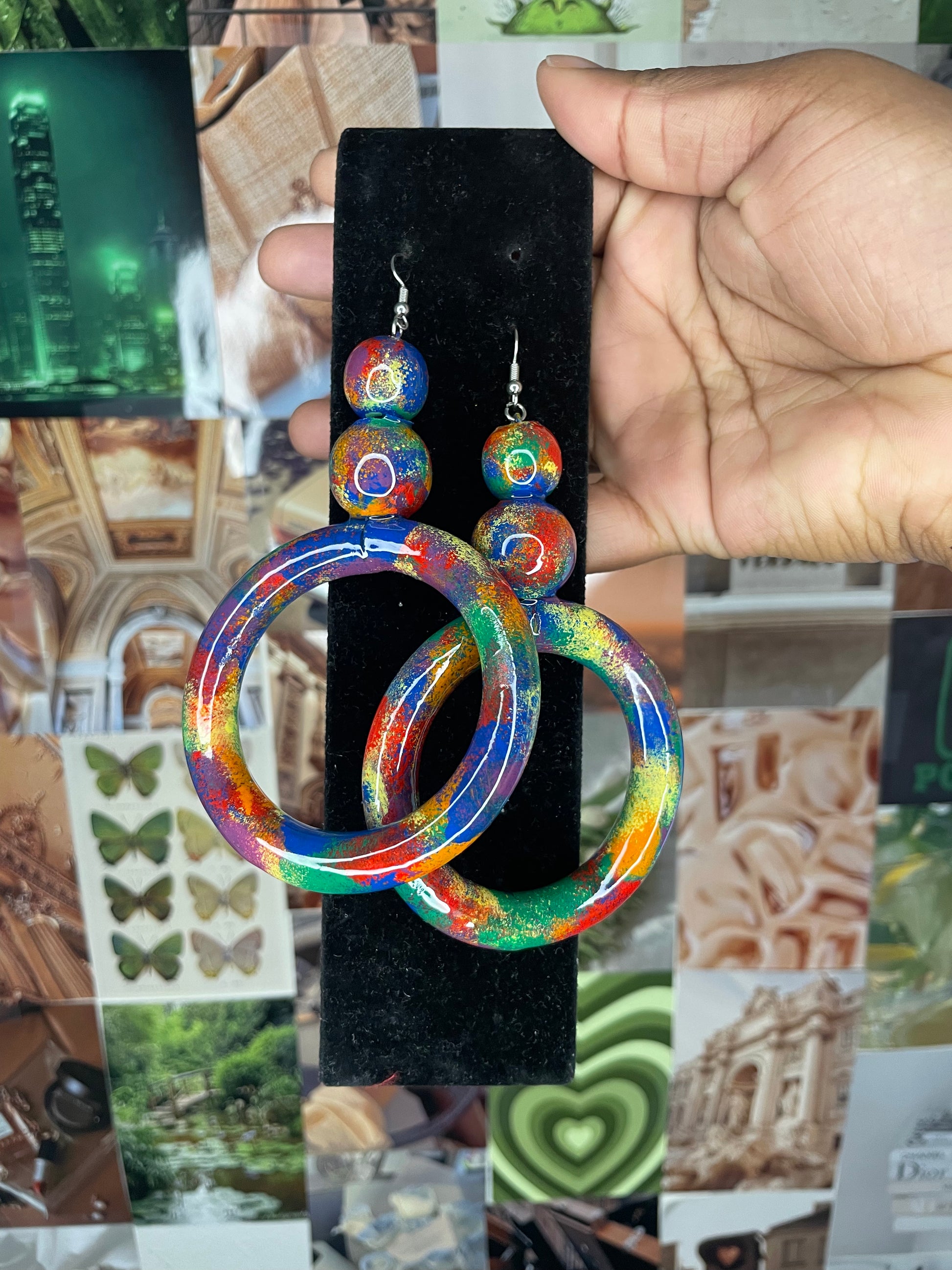 two rainbow balls connected to a rainbow circle and silver earring hook.