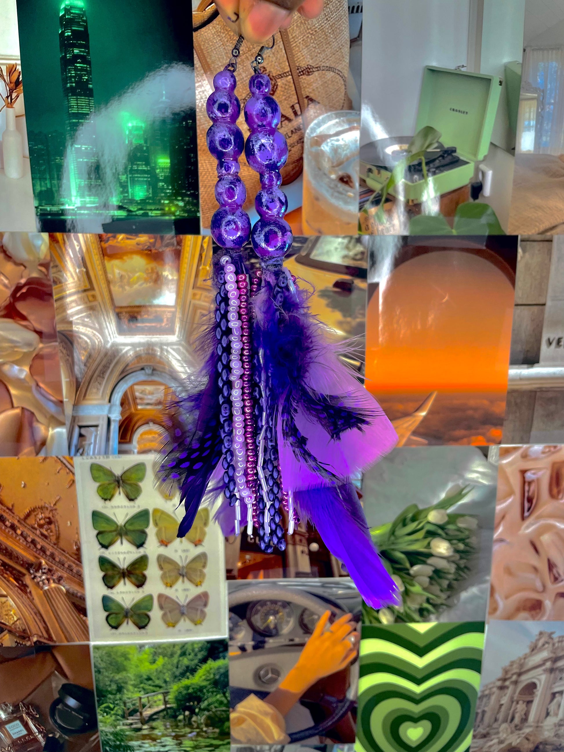 Purple Dangling Earrings. Six different sized purple splash painting balls with feathers and beads dangling down. Earrings on black/gray dangling hooks.